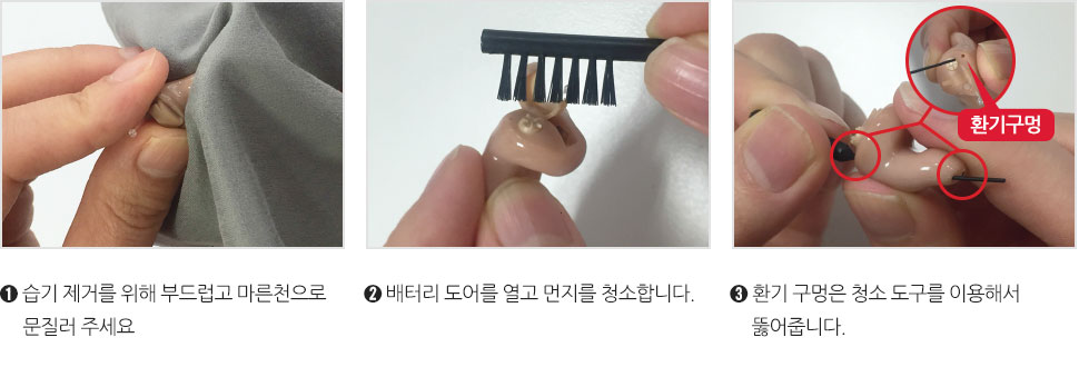 보청기는 열과 온도에 약합니다. 샤워할 때나 드라이할 때에는 반드시 보청기를 귀에서 빼십시오.